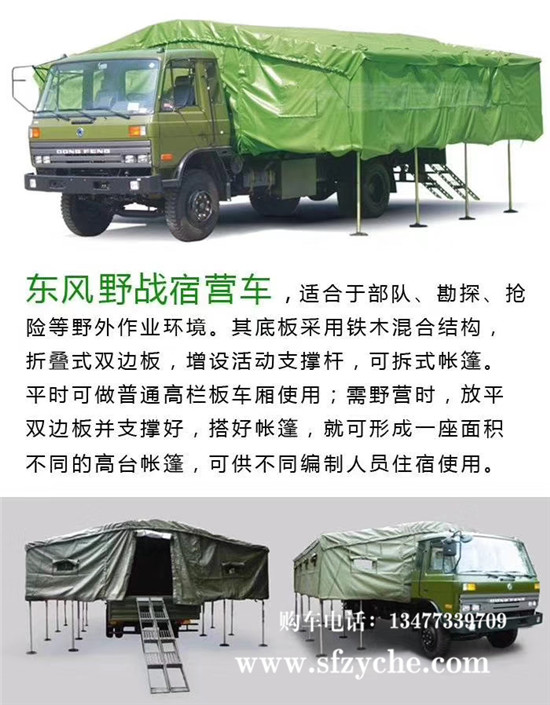 東風(fēng)原廠EQ5118XZS6D15型宿營車和EQ5120GA1型天錦宿營車6.1米篷布配套直供。適用于東風(fēng)EQ5118XZS6D15宿營車和EQ5120GA1天錦宿營車等東風(fēng)系列車型,軍用宿營車供部隊野外住宿使用。車箱內(nèi)部尺寸6100mmX2210mmX1850mm。宿營車車廂在采用折疊式雙邊板,增加滑道內(nèi)設(shè)支撐桿,可拆式帳篷。平時可作為普通高欄板軍車使用;部隊需野營時,放平雙邊板并支撐好,搭好帳篷,就可以形成一座面積達38㎡的高臺帳篷,可供36人住宿用。 東風(fēng)原廠宿營車篷布總成價格一套為5300元含稅。