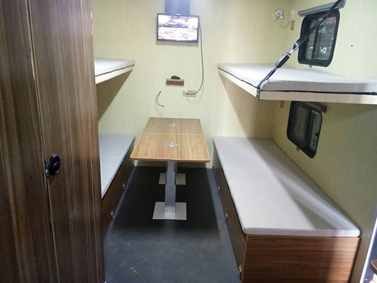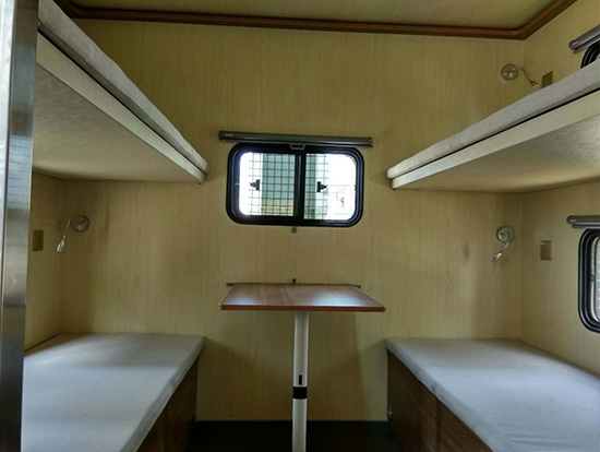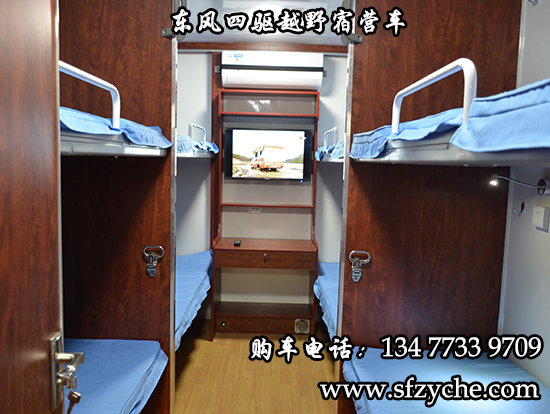 東風(fēng)大型四驅(qū)越野房車滿足更多路況復(fù)雜環(huán)境使用,廂體內(nèi)裝有豪華折疊床、液晶電視、儲物柜、應(yīng)急燈、頂燈、頂置空調(diào)、床墊、被褥、燃油加熱器、頂護欄、爬梯、隱藏抽拉梯、專用房車門、中空玻璃、戶外燈。由保溫廂體、空氣調(diào)節(jié)系統(tǒng)、宿營設(shè)施、影音系統(tǒng)、電氣系統(tǒng)、通風(fēng)換氣系統(tǒng)、洗漱和衛(wèi)生設(shè)施。整個廂體分為三個部分,住宿區(qū)、洗漱區(qū)、餐飲區(qū)。住宿區(qū)包括四個上下鋪,床頭燈,液晶電視,空調(diào)等。洗浴區(qū)包括臉臺,衛(wèi)生間,熱水器等。餐飲區(qū)包括無煙灶臺,可活動餐桌,洗菜盆等。也可以根據(jù)用戶的需要設(shè)計,可增加會議室,辦公區(qū)等。東風(fēng)大型四驅(qū)越野房車內(nèi)飾圖片: