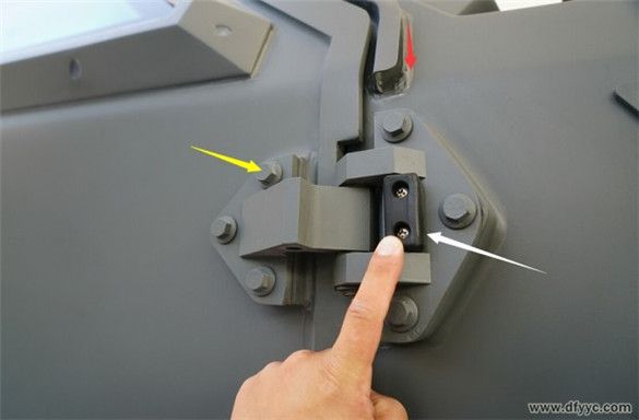 外拉手由上向下旋轉(zhuǎn)開啟,并采用一字鎖鑰匙鎖閉。紅色箭頭所指的是固定車門鎖具的螺栓。