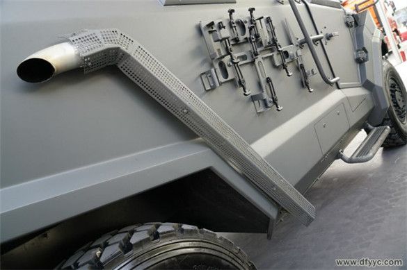 無論外觀還是尺寸,東風(fēng)四驅(qū)防雷反恐戰(zhàn)車都高于猛士系列裝甲車,幾乎與大疆系列反恐安全車相當。三車門的設(shè)定,便于正副駕駛員與戰(zhàn)斗班組快速進出裝備。排氣管從車身中段經(jīng)過右后側(cè)圍延伸車體外,使其不經(jīng)準備就可在兩棲涉水工況下完成相關(guān)機動動作。