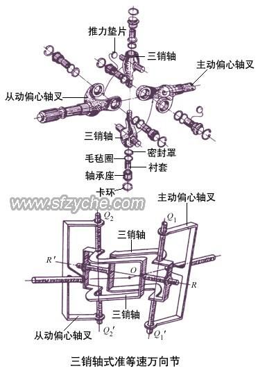 東風(fēng)尖頭軍車(chē)系列EQ240,EQ245,EQ2081E,EQ2082E6D型六驅(qū)越野軍車(chē)驅(qū)動(dòng)前橋萬(wàn)向節(jié)三肖軸工作原理: