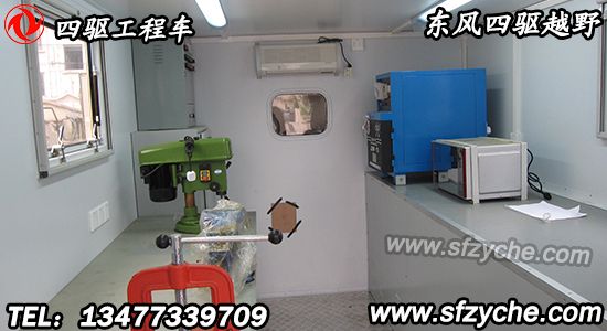 廂體頂部封閉,不可開啟?膳溲b功率相當(dāng)、其他型號的發(fā)電機(jī)組。駕駛室前方安裝電動(dòng)絞盤、廂體前部安裝備胎和可升降照明裝置、廂體內(nèi)部安裝有發(fā)電機(jī)組、電焊機(jī)、線纜盤、臺(tái)虎鉗、切割機(jī)、工作臺(tái)等維修工具。側(cè)防護(hù)、后防護(hù)與車輛均采用焊接連接,材料均為:Q235,后防護(hù)斷面尺寸(mm):100×60, 離地高度:500 mm.