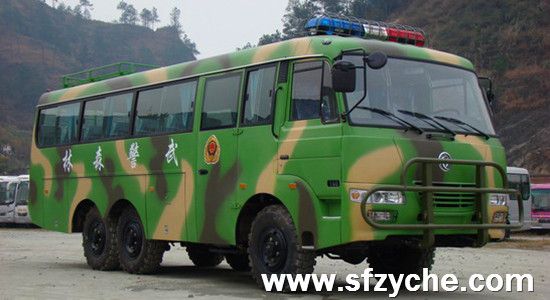 東風(fēng)六驅(qū)越野客車采用康明斯160馬力發(fā)動機(jī),東風(fēng)5擋變速箱,整車長8.4米,寬2.35米,高2930米,采用東風(fēng)EQ6840東風(fēng)特汽越野車專用底盤,最多座位數(shù)30座,采用11R18大花紋越野輪胎,整車迷彩色,選裝空調(diào)暖風(fēng)系統(tǒng)。
