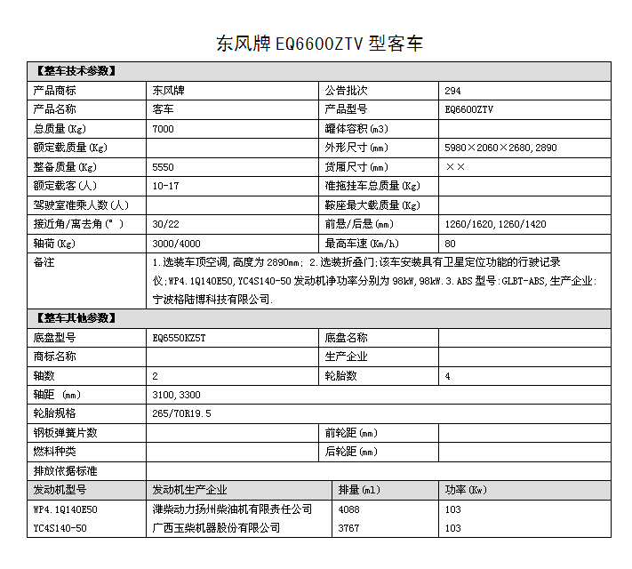 EQ6600ZTV四驅(qū)越野客車圖片,國五排放四驅(qū)10座越野客車價(jià)格,6米四驅(qū)客車多少錢,東風(fēng)四驅(qū)越野客車參數(shù)配置: 1.底盤型號(hào)EQ6550KZ5T,發(fā)動(dòng)機(jī)型號(hào):YC4S140 50 國五排放 2.整車外形尺寸長(zhǎng)寬高:(5980×2060×2890)mm 驅(qū)動(dòng)形式:4×4 東風(fēng)分時(shí)四驅(qū) 3.離合助力,方向助力,斷氣剎,鼓式自動(dòng),駕駛區(qū)域空調(diào) 4.車橋?yàn)闁|風(fēng)德納,輪胎為265/70R19.5型越野輪胎,ABS 5.工具箱,前置防裝杠,粘接式推拉玻璃,發(fā)動(dòng)機(jī)底板防護(hù) 6.鋁花紋地板,中檔皮革座椅10個(gè)+1個(gè)折疊座椅,整車座椅安全帶,手動(dòng)式外擺門,正副司...